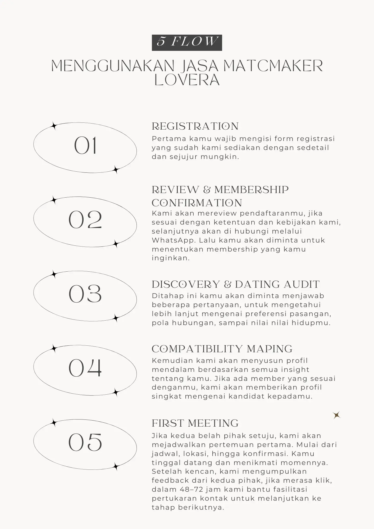 Semuanya dimulai dengan mengenal kamu lebih dalam: mulai dari nilai-nilai yang kamu pegang, gaya komunikasi, ritme hidup, sampai pola hubungan kamu. Dengan gambaran yang utuh itu, Lovera mencari di dalam database kami yang eksklusif dan terkurasi untuk menemukan match yang beneran sejalan dengan kebutuhan emosional dan rencana jangka panjangmu. Jadi, kamu nggak cuma sekadar ketemu orang hebat, tapi memastikan waktu yang kamu luangkan benar-benar mengarah ke hubungan yang bermakna dan bertahan lama.